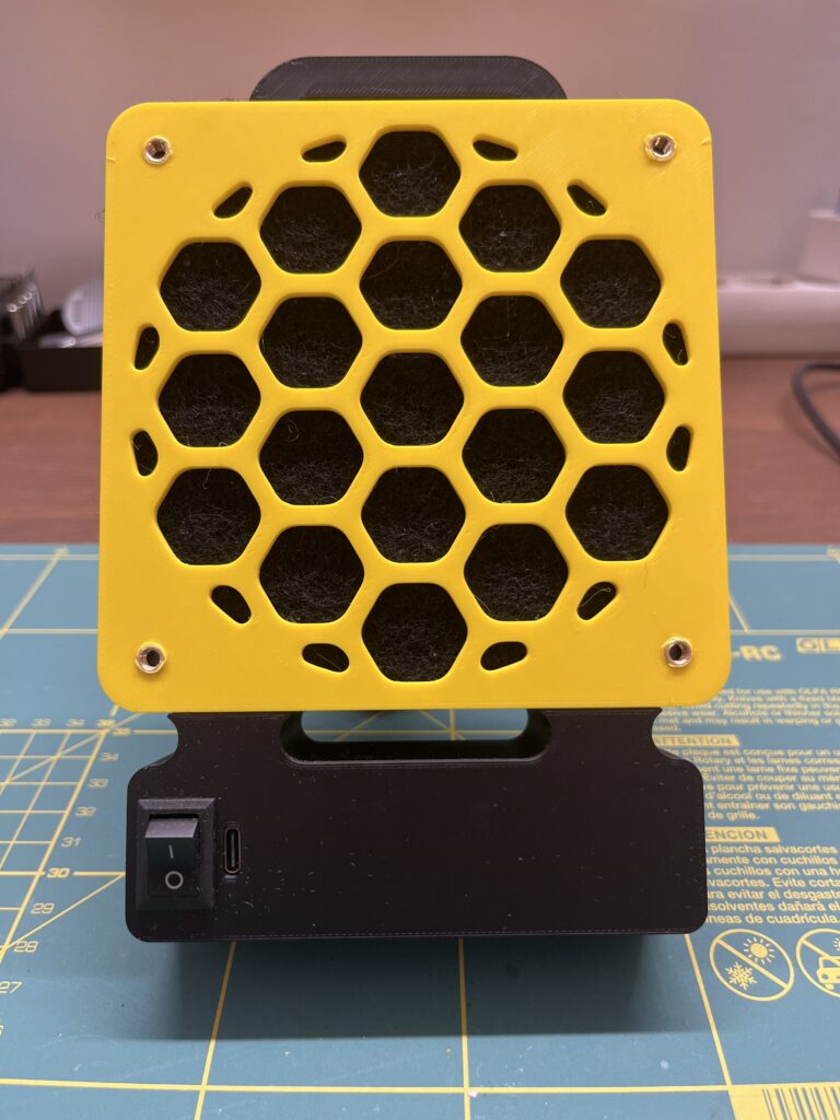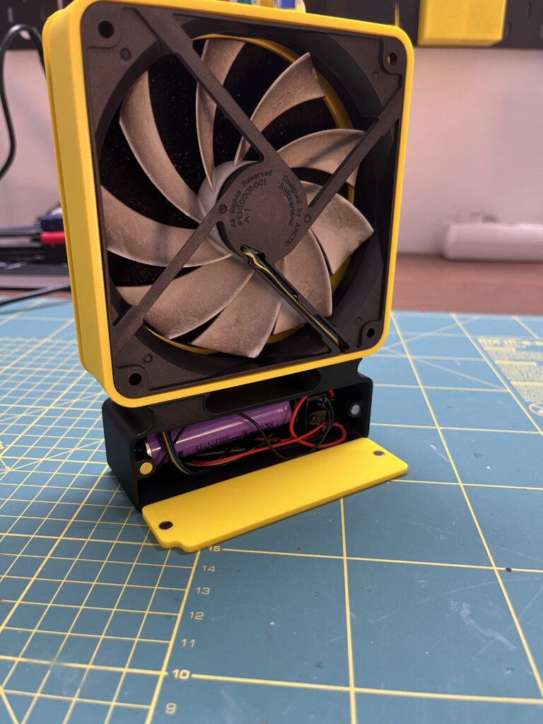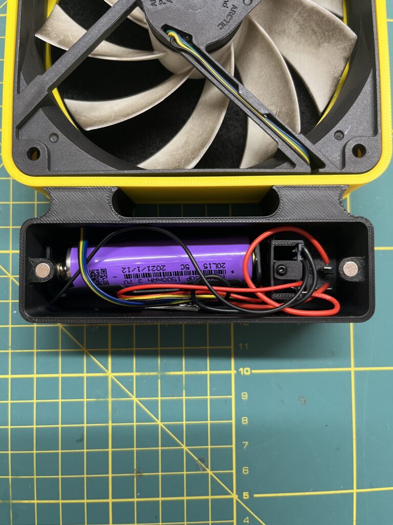 The 18650 powers a standard 120mm PC fan that I salvaged from an old mining rig. It pulls the air through an activated charcoal filter mat.